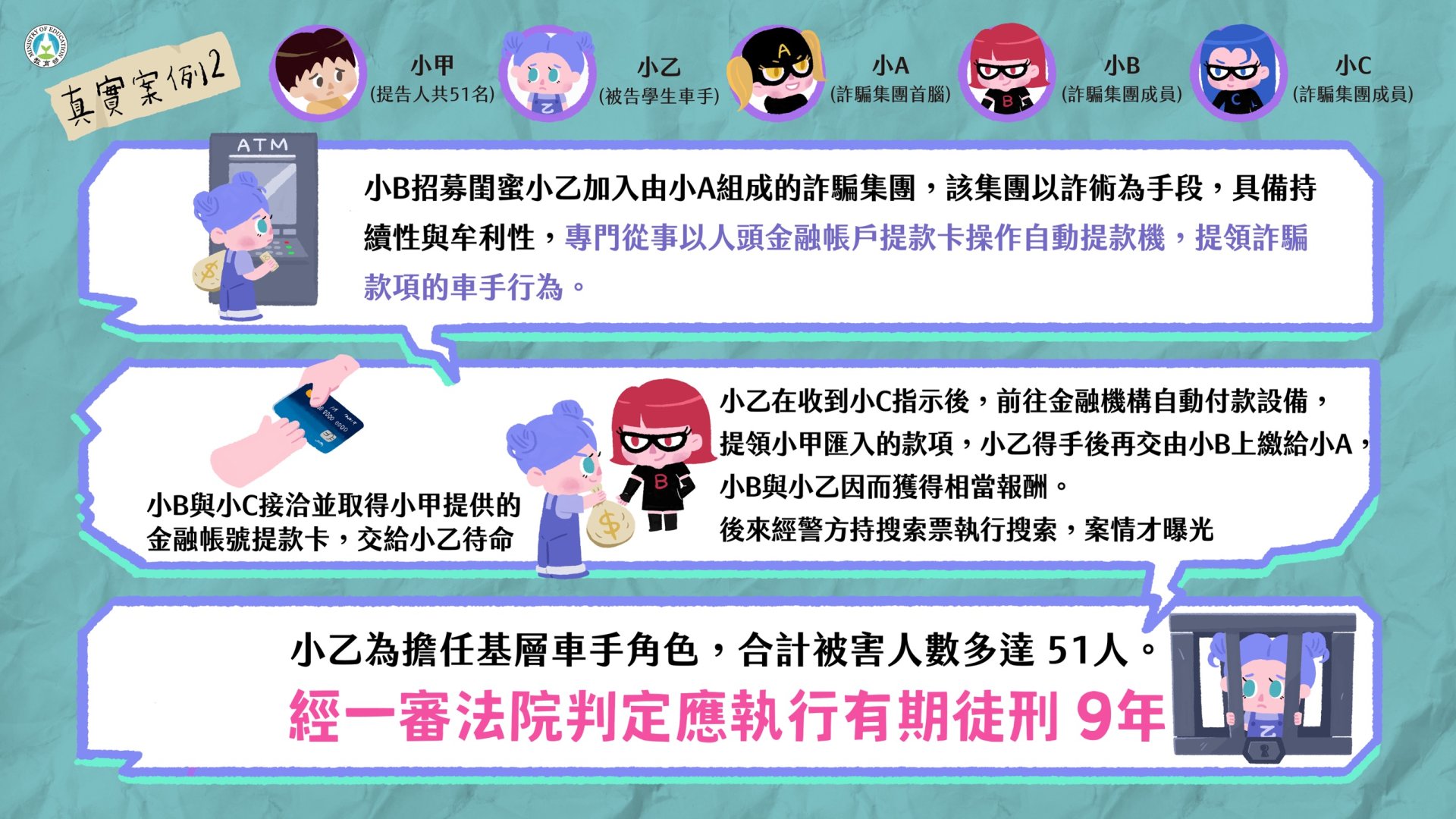 近年來學生擔任車手涉詐欺案件數攀升,尤以12至23歲涉案最多,教育部藉由真實案例,解析學生擔任詐騙車手所可能承擔的法律責任,製作本案懶人包,避免學生遭不法分子利用,衍生後續的法律風險與責任,附上宣導相關圖卡以供參考。